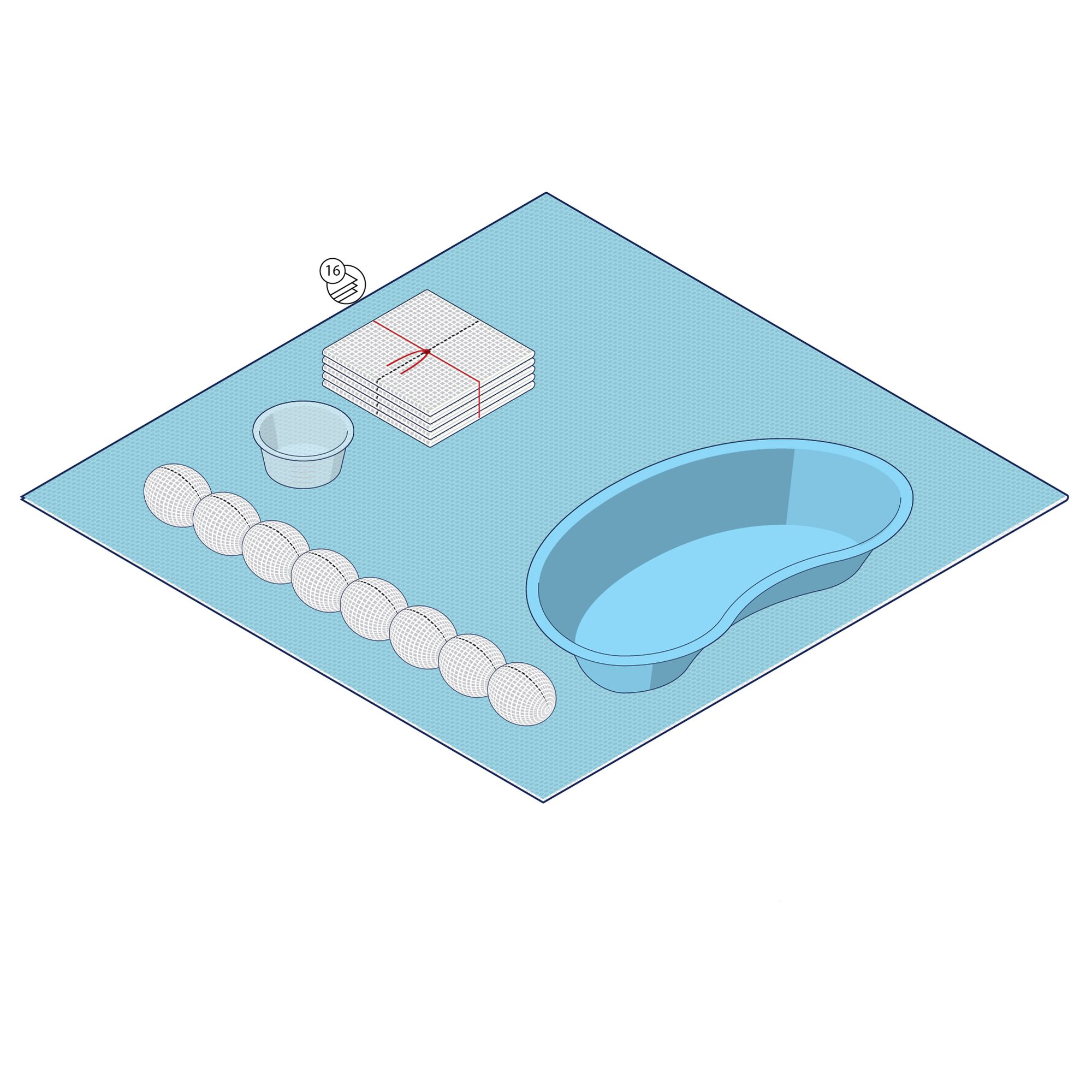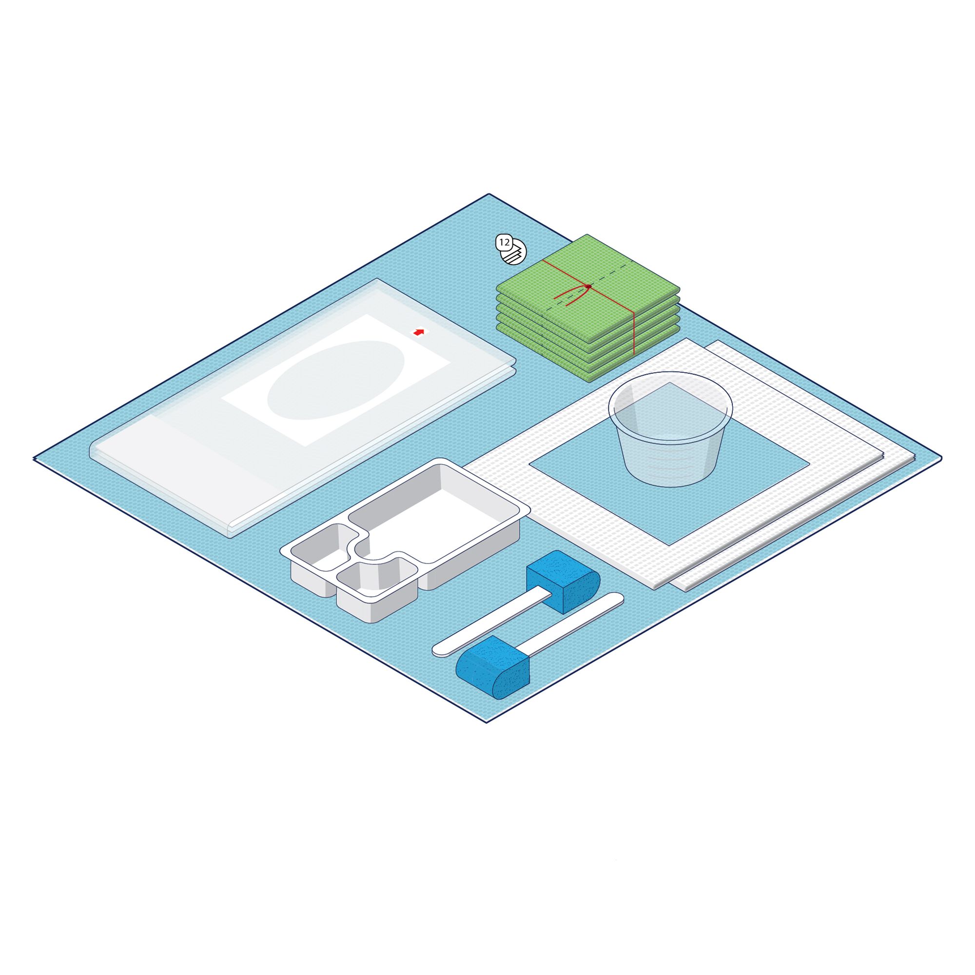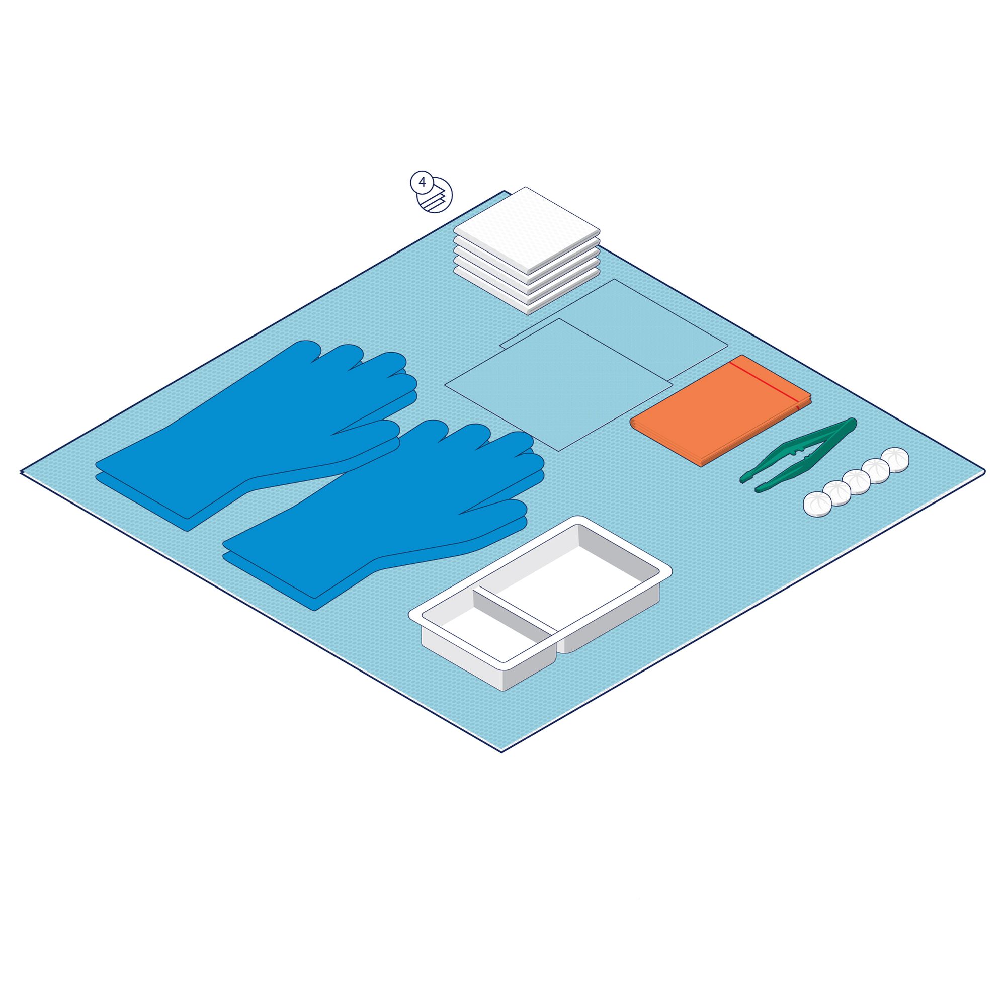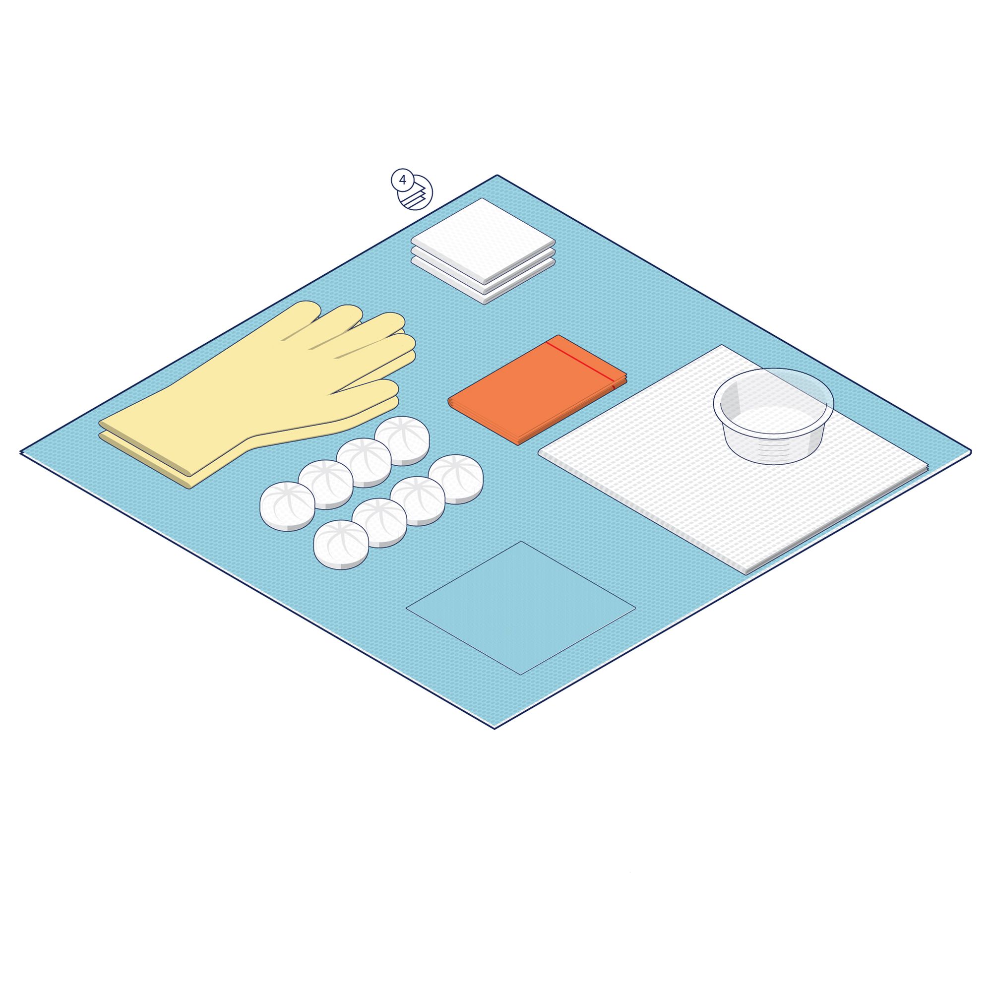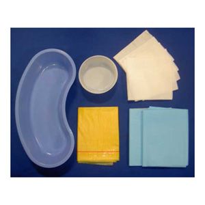 1 x Gallipot (120 ml) 1 x Pair Latex Exam Gloves (Medium) 3 x Non Woven Swabs (7.5 x 7.5 cm, 4 Ply)1 x Fenestrated Tissue–Backed Drape (90 x 90 cm) 1 x Orange Waste Bag with Adhesive Strip (45 x 29 cm) 8 x Non Woven Balls (Medium) 1 x Dressing Towel (38 x 43 cm, 2 Ply) 1 x Sterile Field Drape (50 x 50 cm)